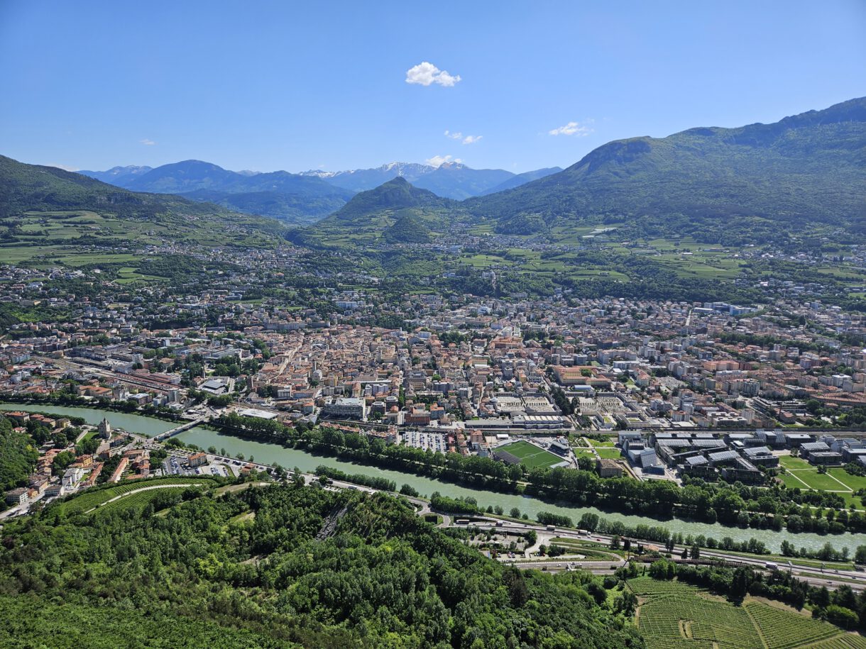 Man hat auch einen tollen Blick herunter auf die Stadt. Man kann sogar ein wenig die alten römischen Stadtgrenzen erkennen und die spätere Vergrößerung Trients durch die Etsch-Verlegung: